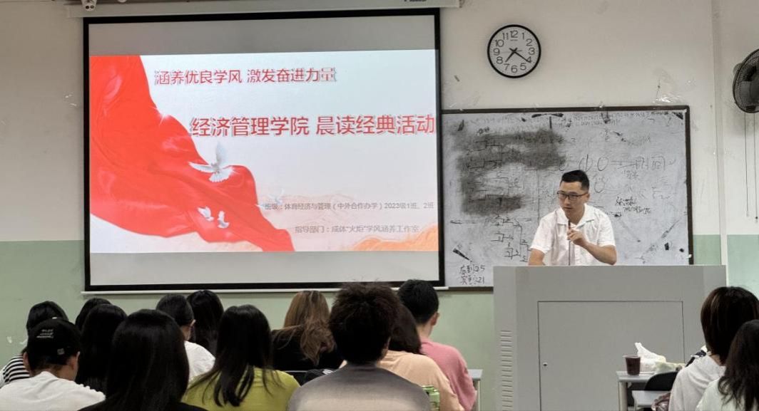 5月22日,体育经济与管理(中外合作办学)专业2023级员工在早读课堂开展了晨读经典活动,辅导员潘同心老师参加指导。