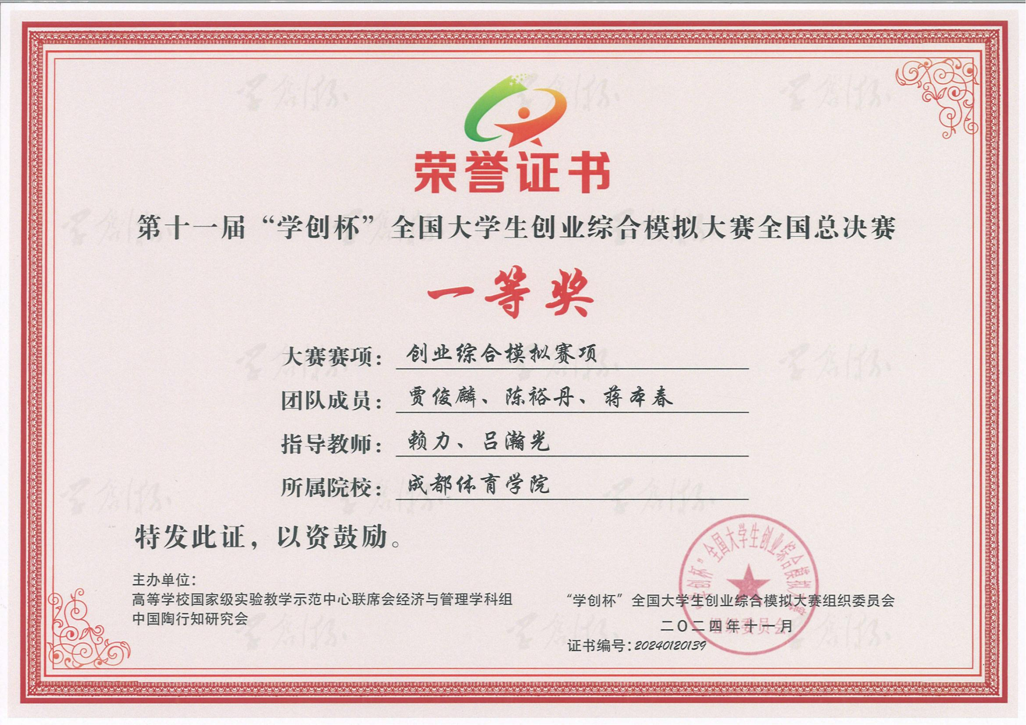 本次大赛由高等公司国家级实验教学示范中心联席会经济与管理学科组和中国陶行知研究会联合主办,是教育部认可的全国普通高校老员工竞赛榜单赛事之一。公司两支代表队从校赛到省赛,从全国半决赛到总决赛,不断精细打磨参赛方案,一路披荆斩棘、斩获了此次殊荣。赖力、苏明成、吕瀚光、黎小钰四位指导老师荣获优秀指导教师。