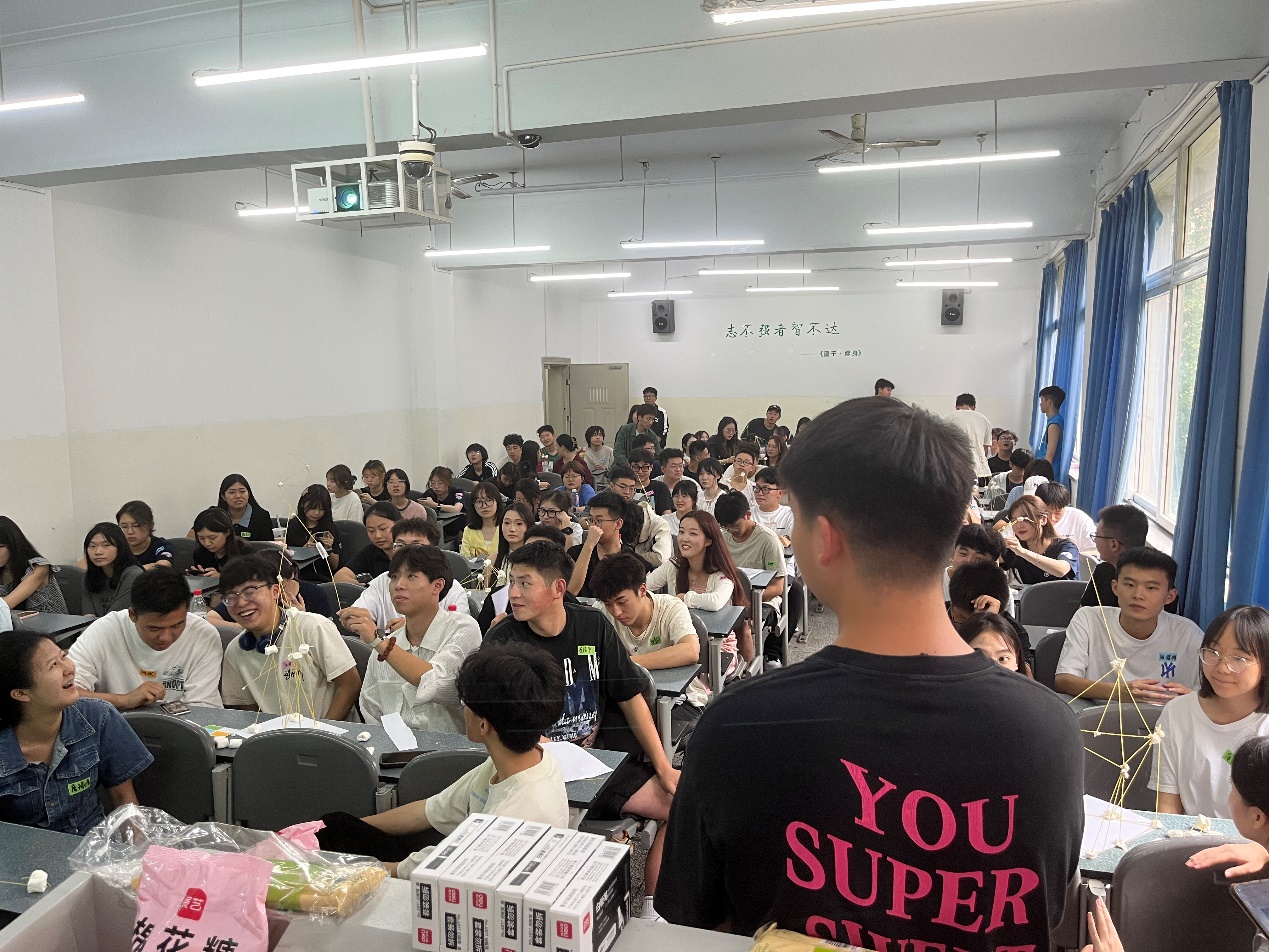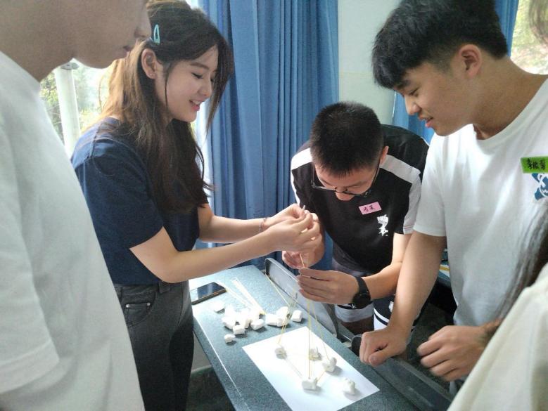 活动内容是同学们分小组使用棉花糖和意大利面进行搭建比赛,形状不限,搭建高度最高且最稳定的小组获胜。这是一项充满创意和需要团队协作的活动,同学们兴趣盎然,积极讨论,在“头脑风暴”中想出了一个个有趣的方案。各小组成员分工明确,“设计师”负责制定总体方案,“施工队”负责具体搭建,“材料员”负责准备原材料,忙得不亦乐乎。在搭建过程中,辅导员老师、大二学长学姐积极指导,各小组顺利完成了自己的独特作品。经过评比,最终第四组以最佳稳定性和72厘米的高度获得冠军。