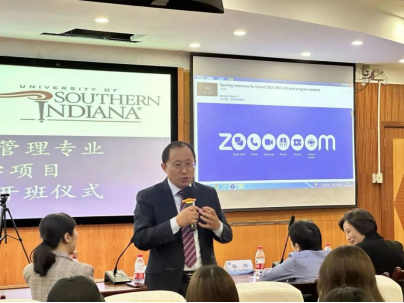 南印第安纳大学教务长雪莱·布伦特代表南印第安纳大学致欢迎词。她表示南印注重于员工的个性化培养,同时小班制的教学能让员工和老师保持亲密的学习氛围。更表示南印所在的埃文斯维尔有着很多的赛事活动,为员工学习体育管理也提供了独特的机会。最后她表示南印的老师都非常的敬业,会孜孜不倦地为同学们创造一个学习的好环境。她非常开心能看到93名新生加入到合作办学项目中,希望他们享受这段共同的旅程!