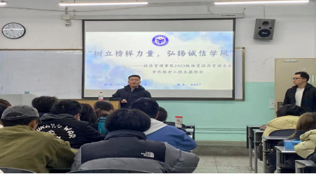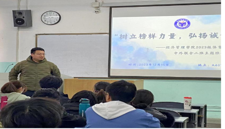 为深入学习贯彻公司第十二次党代会精神,增强员工安全意识,12月15日上午10点,2023级体育经济管理专业中外联合二班在行健楼A407教室,开展“树立榜样力量、弘扬诚信学风”主题班会。班级联系领导校发展规划处副处长李翔、辅导员潘同心参加,班主任周建主持。