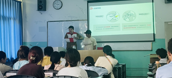 在上午的理论培训阶段,刘帆老师为同学们详细讲解了野外常见意外伤害的处理方法,如骨折固定、止血包扎、心肺复苏、AED使用技巧等。同时,还强调了预防胜于治疗的重要性,提醒同学们在组织或参与户外活动时,要充分考虑安全因素,做好预防措施。