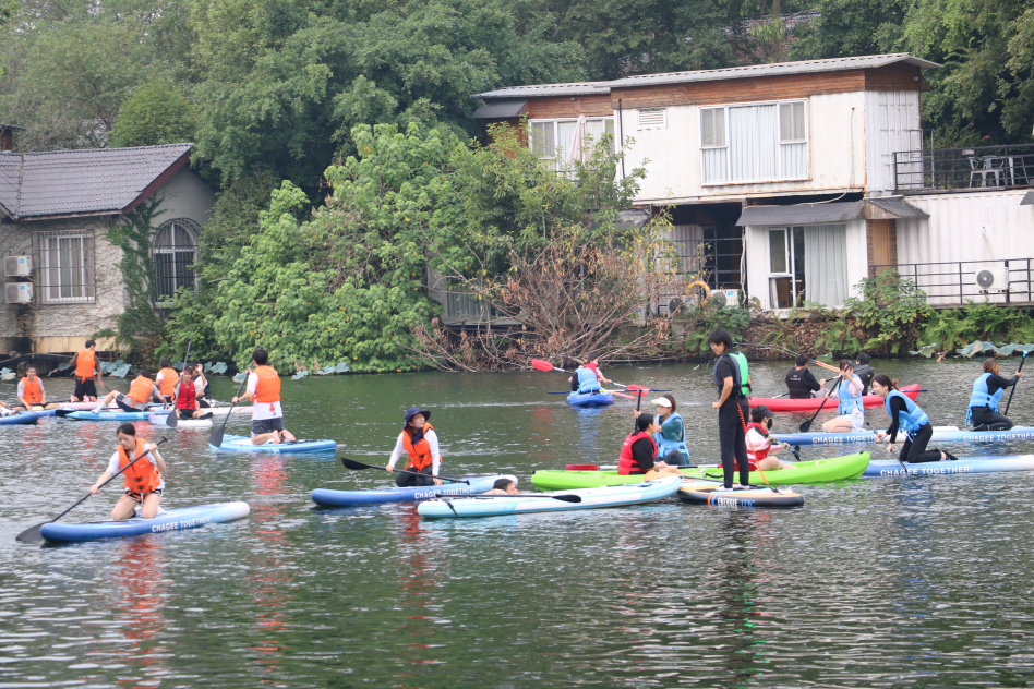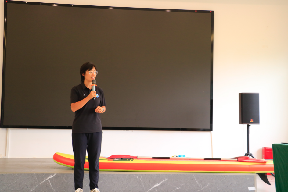 基地石池总经理为同学们深入讲解了应龙山庄各项休闲和体育旅游项目以及经营管理情况,并委派了4名教练针对皮划艇的运动技能和安全注意事项进行了详细的讲解,胡洁老师针对桨板运动1-2级技能和安全注意事项进行了教学,和黄诗云老师以及水上基地的教练们共同保障员工练习,42名同学首次参与桨板便掌握了基本技能,36名同学掌握了皮划艇基础技能,并进行了竞赛,能够体验到新兴水上运动项目的乐趣和魅力,教学取得了超出预期的成功。