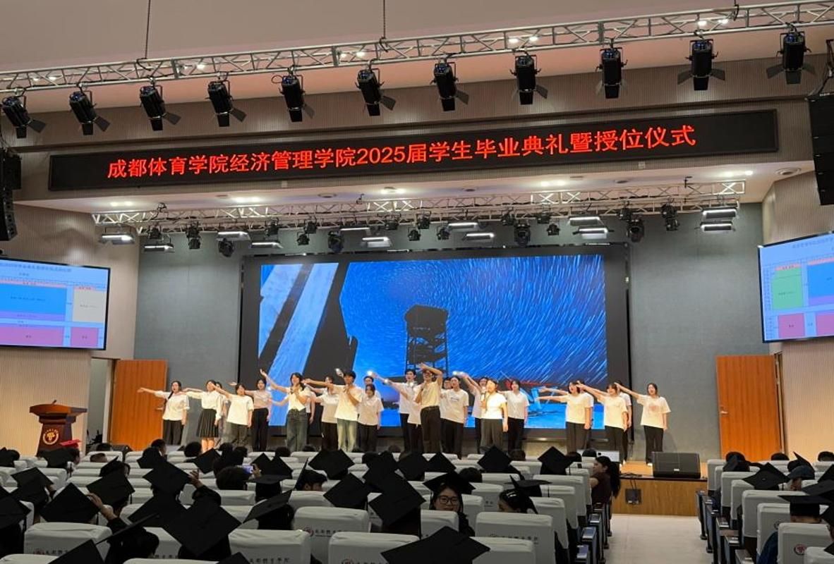 毕业典礼在温馨的氛围中拉开帷幕。学弟学妹们献上暖场节目,深情合唱歌曲《仰望星空》表达了对学长学姐的美好祝愿。