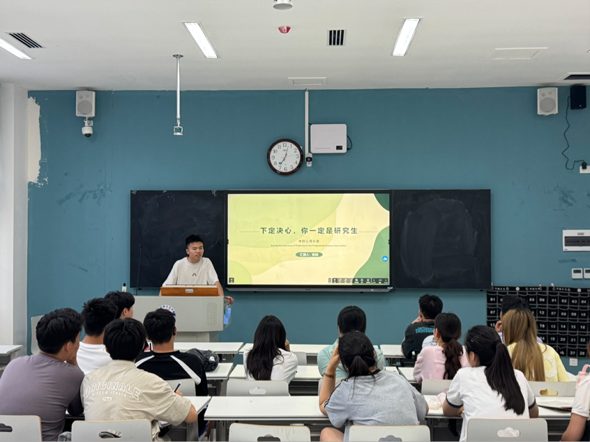 会上,三位同学依次分享了自己的考研经历和经验心得,分科目总结了许多考研技巧和注意事项,并鼓励大家在备战考研过程中要有坚定的信念和坚持不懈的意志力。互动环节,同学们积极提问,就择校策略、复试准备、心态调整等问题展开深入交流,现场气氛轻松热烈。