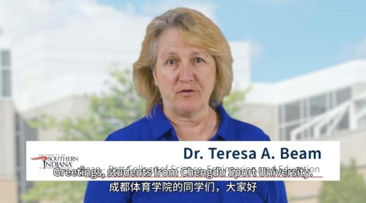 接着,见面会现场播放了南印第安纳大学波特科学、工程与教育公司经理Teresa A. Bean对新生的寄语。她鼓励同学们积极搭建文化交流的桥梁,努力成为体育管理领域的领军者。