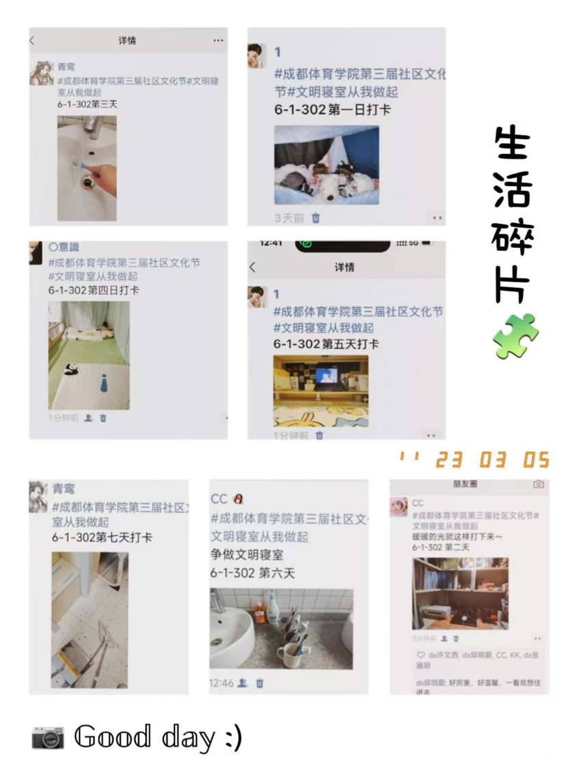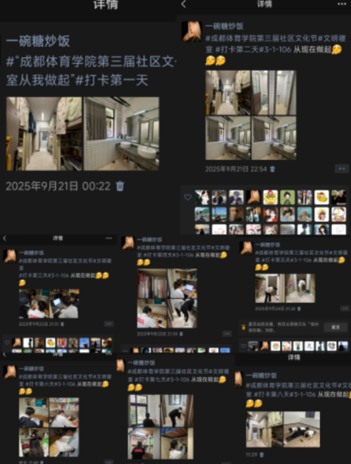 在为期一周的“美好生活日记”打卡环节中,各参赛寝室每日在朋友圈发布寝室生活照片,并配文指定话题,连续打卡7天,展现真实日常的寝室生活。同时,公司组织教师开展常态化卫生检查,重点核查日常整洁与保持情况,杜绝临时突击,确保评比公平有效。