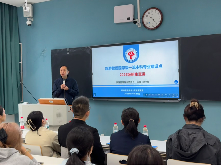 首先,杨强教授介绍了旅游管理专业的育人特色、课程体系与发展前景,重点剖析了专业未来的就业方向与核心竞争力。他勉励新同学们要锚定目标、潜心向学,充分利用公司提供的优质平台,不断提升专业素养与综合能力,为未来职业发展奠定坚实基础。